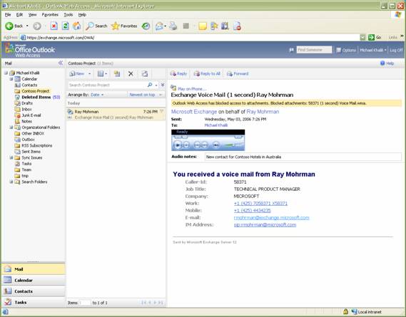 圖3:Outlook Web Access 2007 提供了語音郵件消息的直接可訪問視圖