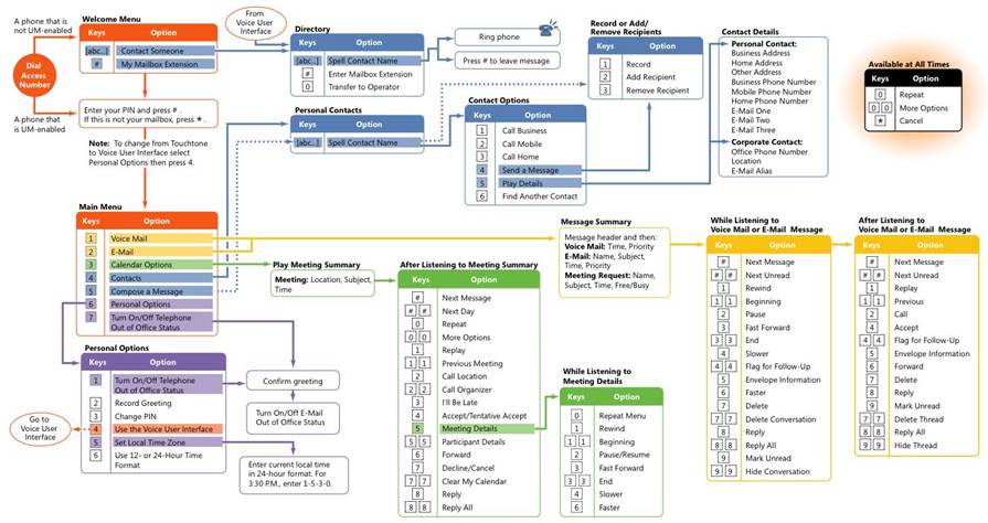 允許用戶通過電話處理他們的消息和日歷數(shù)據(jù)(包括收聽、轉(zhuǎn)發(fā)和回復(fù)電子郵件,以及發(fā)出、更新或響應(yīng)會(huì)議請求)。用戶可以標(biāo)記消息以便跟蹤、跳到下一封未讀郵件、隱藏或刪除對話,甚至查找來自特定用戶的消息,這一切全都使用語音導(dǎo)航或標(biāo)準(zhǔn)按鍵式鍵盤來完成。
