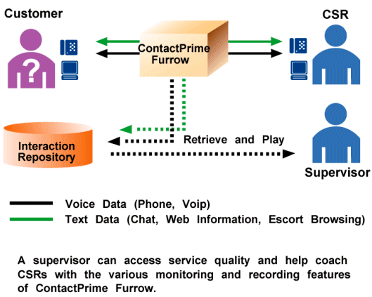 ContactPrime Furrow提供的完全記錄解決方案可以協(xié)助進(jìn)行訓(xùn)練、性能評(píng)估、交易驗(yàn)證與爭(zhēng)議解決等工作。不僅記錄語音呼叫,而且對(duì)于聊天、陪同瀏覽和Web互操作等文本行為也可記錄。