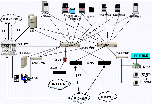 用戶撥打聯(lián)通客戶服務(wù)系統(tǒng)特服號(hào)碼1001,呼叫經(jīng)過電話網(wǎng)絡(luò)匯接到省中心匯接局,然后接入本系統(tǒng)。本系統(tǒng)的呼叫匯接采用《中國(guó)聯(lián)通客戶服務(wù)系統(tǒng)技術(shù)規(guī)范書》規(guī)定的匯接方式。