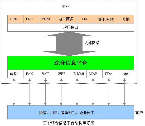 東華集團(tuán)綜合信息平臺(tái)系統(tǒng)可集中企業(yè)客戶服務(wù)的優(yōu)勢(shì)資源,采用人工業(yè)務(wù)代表服務(wù)與自動(dòng)語(yǔ)音服務(wù)相結(jié)合的形式,通過(guò)電話、Email、Web、尋呼、IP電話/傳真、視頻、段消息等接入方式和服務(wù)手段,向客戶提供業(yè)務(wù)受理、信息查詢、商品定購(gòu)服務(wù),以及接受客戶的咨詢、建議及投訴,也可以通過(guò)主動(dòng)撥出做社會(huì)調(diào)查、市場(chǎng)調(diào)查、商品直銷及資費(fèi)欠費(fèi)催繳等。