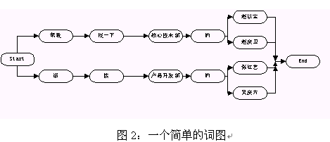 在語音識別中,語言模型是用來指導(dǎo)引擎進行語音識別的,它限定了一個識別引擎所能表達的語句類型。在我們常用的圖搜索引擎中,語言模型是通過語法來表示的,語法是由一系列表示某個領(lǐng)域的語言表達方式的規(guī)則組成的(語法的具體書寫規(guī)則見引擎使用說明書)。這些規(guī)則會被被轉(zhuǎn)換成詞圖的形式然后用來指導(dǎo)語音的識別。所謂的詞圖是指由詞作為節(jié)點的一個圖,從該圖的開始節(jié)點到末尾節(jié)點的任一條路徑都是一個有效合法的句子。圖2給出了一個簡單的詞圖。