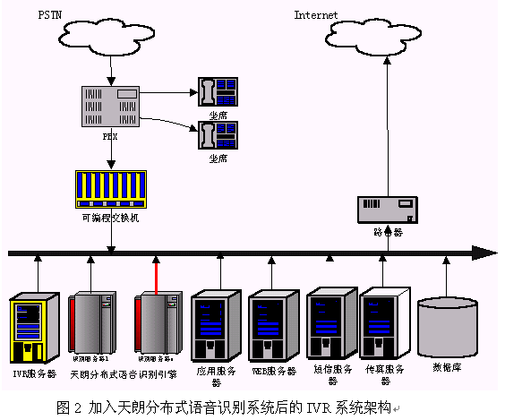 硬件連接:天朗分布式語音識別系統(tǒng)是通過局域網(wǎng)來把客戶端和服務器連在一起。因此在硬件上把天朗分布式語音識別系統(tǒng)聯(lián)入到IVR的一種簡單的辦法是把引擎的所有服務器接入到系統(tǒng)現(xiàn)有的局域網(wǎng)中,使得識別服務器能和IVR服務器通過TCP/IP通訊即可。連接后的系統(tǒng)架構可以用圖2來表示。