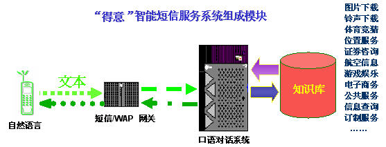 "得意"智能短信系統(tǒng)是在現(xiàn)有的數(shù)據(jù)通信和短信服務(wù)的技術(shù)平臺(tái)上,加入基于中文語(yǔ)言理解技術(shù)的"得意"口語(yǔ)對(duì)話系統(tǒng),從而能夠讓用戶在手機(jī)上以自然語(yǔ)言的形式享受指定領(lǐng)域的智能短信服務(wù)。智能短信系統(tǒng)對(duì)短信文本進(jìn)行自動(dòng)分析和理解,再?gòu)闹R(shí)庫(kù)中提取用戶所需的信息,然后自動(dòng)產(chǎn)生智能應(yīng)答語(yǔ)句,并以短信文本的形式發(fā)回用戶。由于"得意"口語(yǔ)對(duì)話系統(tǒng)具有上下文相關(guān)理解和人機(jī)混合主導(dǎo)等強(qiáng)大功能,在規(guī)定的領(lǐng)域內(nèi),用戶可通過一個(gè)或者多個(gè)短信構(gòu)成一組對(duì)話,完成復(fù)雜的信息查詢或者其他互動(dòng)服務(wù)。