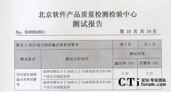 CTI論壇(ctiforum)06月25日消息: 2009年3月02-10日:北京軟件產(chǎn)品質(zhì)量檢測檢驗中心對《海量語音文件的目標(biāo)說話人篩選系統(tǒng)》進(jìn)行了全面測試包括用戶文檔、功能性、可靠性、易用性、可維護(hù)性等多個特性。測試結(jié)果表明《海量語音文件的目標(biāo)說話 2009年3月02-10日,北京軟件產(chǎn)品質(zhì)量檢測檢驗中心對《海量語音文件的目標(biāo)說話人篩選系統(tǒng)》進(jìn)行了全面人篩選系統(tǒng)》滿足軟件相關(guān)國家標(biāo)準(zhǔn)中的要求,系統(tǒng)在模擬測試環(huán)境中運行正常、穩(wěn)定,正式通過北京軟件產(chǎn)品質(zhì)量檢測檢驗中心的嚴(yán)格測試,系統(tǒng)的漏識率和誤警率分別達(dá)到了2.81%和 2.81%。