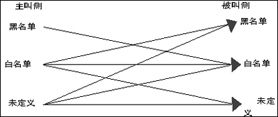 主/被叫黑白名單是號(hào)碼防火墻的一種簡(jiǎn)易實(shí)現(xiàn)方式。黑白名單能夠在有限分類(lèi)的情況下,提供相對(duì)豐富的權(quán)限控制能力。具體說(shuō),黑白名單就是把電話(huà)號(hào)碼分為三類(lèi),并定義這些分類(lèi)之間的呼叫限制。(如圖2)