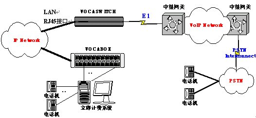 通過在本地IP電話網(wǎng)絡內增加一臺或數(shù)臺網(wǎng)關(VOCASWITCH)直接連接到VoIP骨干網(wǎng)絡的網(wǎng)關的E1端口,實現(xiàn)IP電話呼叫轉接。物理連接如圖所示。