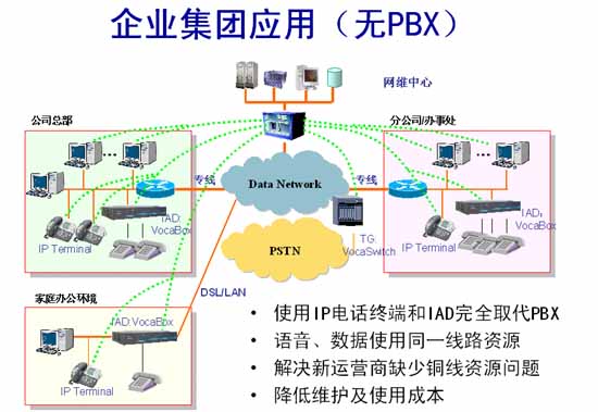 在總部、各個(gè)分公司、辦事處按照容量的大小可以安裝多臺VocaBox/IAD,并利用VocaBox自帶的FXO接口與本地PSTN網(wǎng)互通,在總部可用VocaSwitch的E1接口與PSTN互通。
