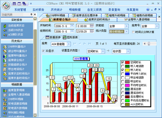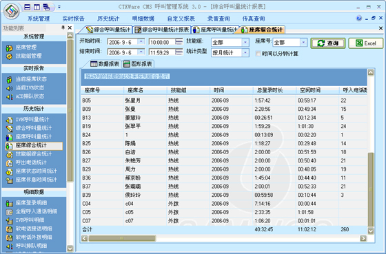 座席綜合統(tǒng)計(jì):可以根據(jù)“月份”、“天”、“小時(shí)”來統(tǒng)計(jì)每一個(gè)座席的綜合指標(biāo)。統(tǒng)計(jì)的指標(biāo)包括:總登錄時(shí)長(zhǎng)、空閑時(shí)長(zhǎng)、呼入電話數(shù)、呼入時(shí)長(zhǎng)、平均呼入時(shí)長(zhǎng)、呼出電話數(shù)、呼出時(shí)長(zhǎng)、平均呼出時(shí)長(zhǎng)、通話總數(shù)、通話總時(shí)長(zhǎng)、后處理時(shí)長(zhǎng)、平均后處理時(shí)長(zhǎng)、AUX總時(shí)長(zhǎng)、電話振鈴時(shí)長(zhǎng)、平均振鈴時(shí)長(zhǎng)、轉(zhuǎn)移次數(shù)、磋商次數(shù)、保持次數(shù)、平均保持時(shí)長(zhǎng)。
