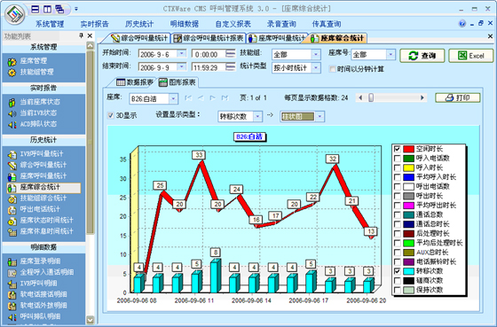 綜合呼叫量統(tǒng)計(jì):可以根據(jù)“月份”、“天”、“小時(shí)”、“半小時(shí)”、“周”來統(tǒng)計(jì)綜合呼叫量。統(tǒng)計(jì)的指標(biāo)包括:呼入電話總數(shù)、進(jìn)入ACD電話總數(shù)、ACD應(yīng)答電話數(shù)、ACD通話時(shí)長(zhǎng)、ACD放棄電話數(shù)、軟電話呼出電話數(shù)、軟電話呼出時(shí)長(zhǎng)、排隊(duì)接通率。