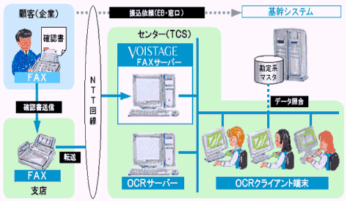 系統(tǒng)結構中心每天收到FAX7~800張。客戶數(shù)約 1,400家。系統(tǒng)配置是有VOISTAGE(VS-403MC)功能的FAX服務器和OCR