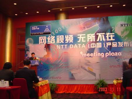 2003年11月11日,NTT DATA(中國(guó))有限公司,在長(zhǎng)城飯店舉行了名為“網(wǎng)絡(luò)視頻——無(wú)所不在”的產(chǎn)品發(fā)布會(huì)。會(huì)上,NTT DATA(中國(guó))有限公司正式推出了一款網(wǎng)絡(luò)視頻軟件產(chǎn)品——“MeetingPlaza”。此產(chǎn)品開(kāi)拓了視頻系統(tǒng)在圖像效果、控制靈活度以及性?xún)r(jià)比上的全新應(yīng)用模式。該產(chǎn)品的開(kāi)發(fā)商N(yùn)TT-IT,自2001年6月起在日本開(kāi)始系統(tǒng)的銷(xiāo)售及提供ASP服務(wù)。到現(xiàn)在已經(jīng)向500家以上的日本企業(yè)及地方政府提供了服務(wù),在日本深受好評(píng)。在中國(guó),雖然軟件視頻會(huì)議系統(tǒng)還處在起步階段,但依據(jù)未來(lái)視頻通訊的廣大需求,以及“MeetingPlaza”具有的投入成本低、限制少和適用性強(qiáng)的特點(diǎn),都將使該產(chǎn)品更加具有市場(chǎng)潛力。
