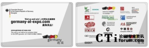 CTI論壇(ctiforum)5月17日消息(記者 潘婷婷):2010年5月,世人矚目的上海世博會已經(jīng)隆重開幕,德國館是其中的大熱門之一。想一睹德國館的風(fēng)采,一般都需要排2~3個小時的長隊(duì)。而觀眾可能不知道除了德國國家館外,德國還有多個城市在浦西的城市最佳實(shí)踐區(qū)展出。為了讓觀眾更好、更全面地體驗(yàn)德國參展的所有活動,德國駐上?傤I(lǐng)事館聯(lián)手智能卡領(lǐng)域的專家捷德公司共同推出了德國館智能參觀卡,觀眾只需持卡參觀德國的其他相關(guān)展區(qū)后,就可以不用排隊(duì)進(jìn)入德國國家館了。