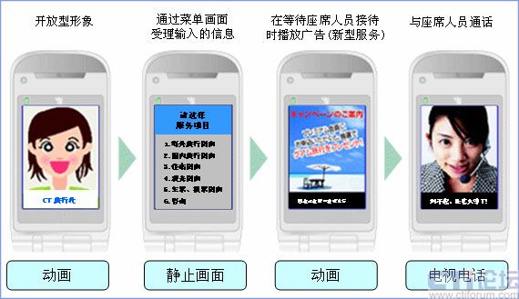 以往的IVR根據(jù)選擇項、層數(shù),必須多遍聽取語音內(nèi)容才能找到預(yù)期的菜單,成了一大課題。視頻呼叫中心則在FOMA的畫面上顯示服務(wù)菜單,通過選擇號碼可以簡化聽取語音的過程。而且,在連接客服人員的電話等待時間中可以播放廣告。通過靈活運(yùn)用這些功能,提高了IVR的操作性,提供了新型廣告宣傳的機(jī)會。