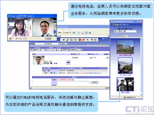 通過“FOMA”的電視電話服務(wù),可以實現(xiàn)面對用戶的表情進(jìn)行服務(wù)。而且,例如,可以實時把握故障發(fā)生地點等只用語言無法準(zhǔn)確傳遞的信息。進(jìn)而,客服人員可以通過FOMA的電視電話功能送出動畫、靜止畫面,利用這些畫面說明情況。通過靈活運(yùn)用這些功能,為實現(xiàn)顧客和企業(yè)之間的熱情友好、高效細(xì)致的通信提供支持。