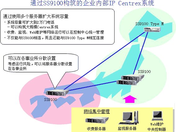 多個SS9100服務器相互協(xié)作,擴大了系統(tǒng)整體容量。以往模型由1個服務器構成,系統(tǒng)最大只能容納5千門電話,而SS9100 R5可以構筑將系統(tǒng)整體容量擴展到容納2萬門電話的大規(guī)模Centrex系統(tǒng)。進而,通過將服務器分散設置在各事業(yè)所的形式,可以考慮分散各事業(yè)所之間故障危險的基礎上構筑系統(tǒng)。