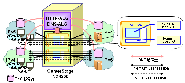 可以在ALG 服務(wù)器刀片上搭載將DNS咨詢進(jìn)行IPv6-IPv4轉(zhuǎn)換的ALG功能。與轉(zhuǎn)換服務(wù)器刀片協(xié)作可以實現(xiàn)IPv6與IPv4的雙方向通信。
