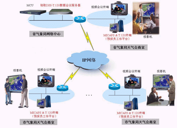 下圖為DSS-T.120數據會議服務器在某省氣象部門視頻會議系統(tǒng)中的典型應用案例。