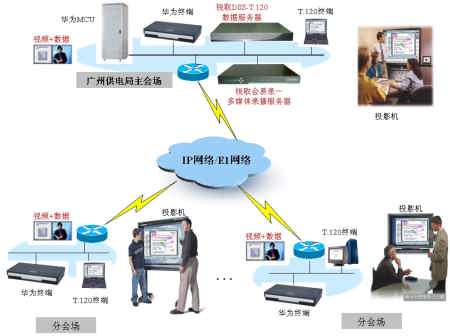 如上圖所示,廣州供電局視頻會議系統(tǒng)基于IP/E1雙網(wǎng)絡(luò),MCU采用華為Viewpoint8620綜合視訊交換平臺,終端采用華為ViewPoint