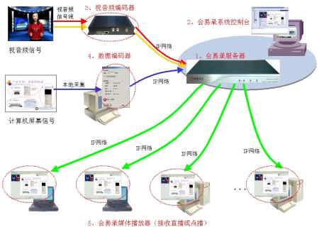 會易錄-多媒體錄播系統(tǒng)可安裝在主會場,通過視音頻編碼器接入主會場視頻會議終端輸出的遠(yuǎn)端/本地視頻及語音(VCR音頻接口)信號,根據(jù)會議進程會議管理員對MCU的進行切換控制,視頻會議終端上會顯示出相應(yīng)遠(yuǎn)程會場的圖像及語音,視音頻編碼器即可該信號采集編碼后發(fā)送給會易錄服務(wù)器。會易錄服務(wù)器可和MCU,T.120數(shù)據(jù)服務(wù)器等設(shè)備安裝在后臺機房或控制室。在同步錄制數(shù)據(jù)內(nèi)容時,可在發(fā)送雙流或參加T.120數(shù)據(jù)會議的PC安裝數(shù)據(jù)編碼器軟件采集計算機屏幕內(nèi)容,會議管理員只要通過會易錄系統(tǒng)控制臺連接上視音頻編碼器和數(shù)據(jù)編碼器后啟動錄制功能即可,會議進行中無需再進行任何操作。會易錄以與會場切換相同的視角,“所見所錄”的模式對視頻會議進程進行忠實、全面的記錄,實用性強,操作維護簡單,極大地降低了會議管理員的工作負(fù)擔(dān)。