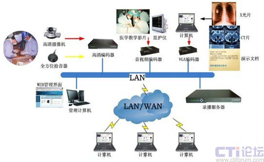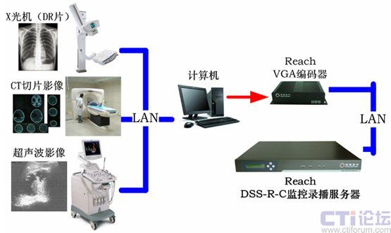 同時(shí),銳取多媒體系統(tǒng)前端VGA編碼器將采集到的計(jì)算機(jī)信號(包含通過網(wǎng)絡(luò)訪問的DR/CR片、CT片)進(jìn)行實(shí)時(shí)編碼和壓縮,通過網(wǎng)絡(luò)與高清視音頻信號以及普通視音頻信號同步傳輸?shù)戒J取多媒體錄播系統(tǒng)遠(yuǎn)程醫(yī)療系統(tǒng)后臺服務(wù)器上。
