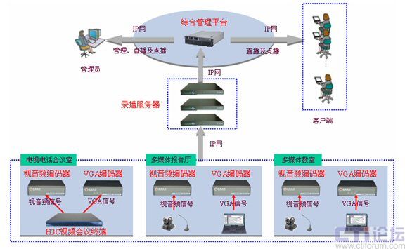 綜合管理平臺(tái)可以實(shí)現(xiàn)多臺(tái)錄播服務(wù)器的集中管理,這樣,通過綜合管理平臺(tái),既可以對(duì)本次項(xiàng)目中的錄播服務(wù)器實(shí)現(xiàn)管理,又可以對(duì)福州大學(xué)原來上有的兩臺(tái)錄播服務(wù)器進(jìn)行管理,實(shí)現(xiàn)三臺(tái)錄播服務(wù)器的集中控制。三臺(tái)錄播服務(wù)器上的文件通過網(wǎng)絡(luò)上傳到綜合管理平臺(tái)上,綜合管理平臺(tái)作為所有節(jié)目和多媒體教學(xué)課件的統(tǒng)一發(fā)布平臺(tái),以門戶網(wǎng)站的方式發(fā)布教學(xué)資源,實(shí)現(xiàn)大容量直播及點(diǎn)播等功能,師生利用校園網(wǎng)上的任意電腦就可以訪問綜合管理平臺(tái),進(jìn)行相應(yīng)教學(xué)資源的檢索或?qū)W習(xí)。