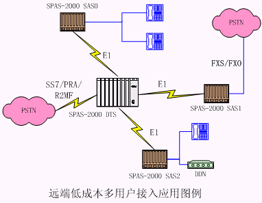 tyutSPAS-2000可編程交換機通過E1可以支持多個遠(yuǎn)端模塊。遠(yuǎn)端模塊采用SPAS-2000 SAS框,可以帶多種用戶接口:普通模擬用戶、DDN、環(huán)路中繼用戶;通過SPAS-2000 DTS對外提供各種信令接入。適合多點接入組網(wǎng),組網(wǎng)成本低廉。 在示意圖中,SAS表示遠(yuǎn)端用戶接入框,它可以通過需要選擇接入模擬用戶:FXO/FXS、E/M、普通模擬用戶和DDN。中心為SPAS可編程交換機,可以通過 SS7/PRA/R2MF進(jìn)行匯接轉(zhuǎn)換。