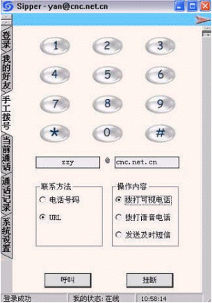 點(diǎn)擊后會(huì)出現(xiàn)對話窗口,同時(shí)在對方的機(jī)器上會(huì)出現(xiàn)你的呼叫請求,如果對方"接收"了你的請求,則兩個(gè)人的語音對話開始,雙方可以互相聽到聲音,沒有圖象,可以同時(shí)進(jìn)行短信交流。