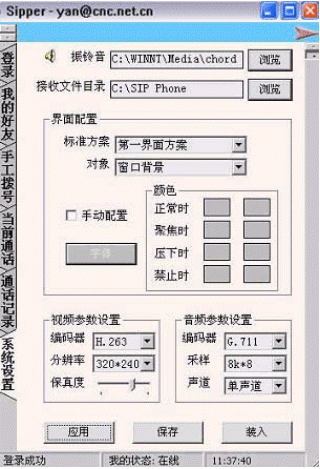 在該窗口中可以對系統(tǒng)的各項(xiàng)參數(shù)進(jìn)行設(shè)置:振玲音、接受文件目錄、界面配色方案、大小視頻等。