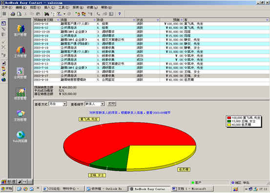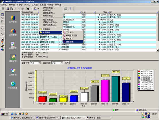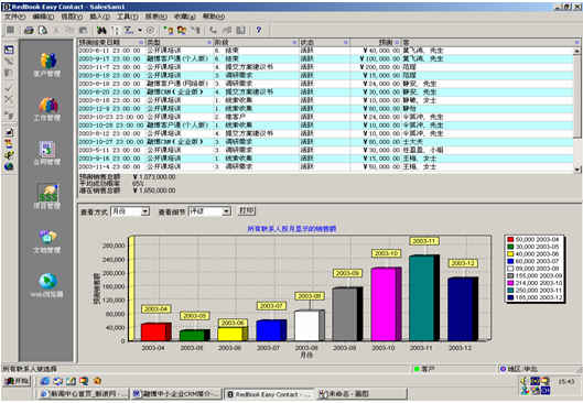 可根據(jù)月份、項(xiàng)目階段、聯(lián)系人、客戶、項(xiàng)目級(jí)別、銷售代表等條件進(jìn)行查看項(xiàng)目細(xì)節(jié),其中有詳細(xì)項(xiàng)目情況列表,也包括圖示。