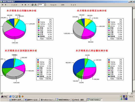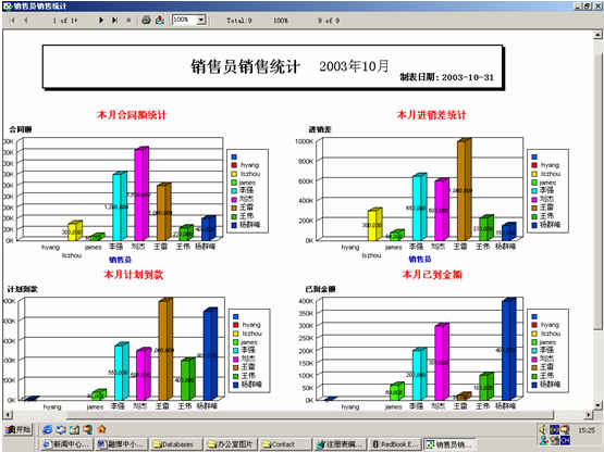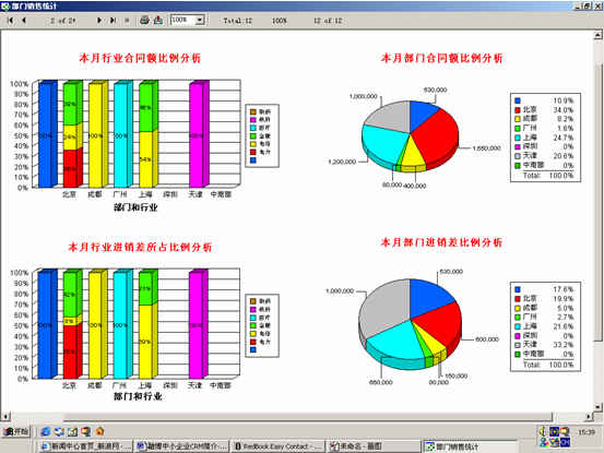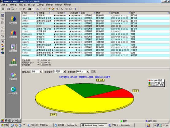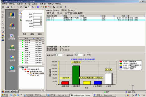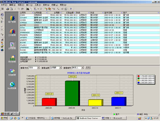 可對(duì)客戶(雇員)合同,根據(jù)合同階段、月份、合同金額、合同應(yīng)收應(yīng)付款、采購成本、客戶、銷售人員等條件進(jìn)行查詢和統(tǒng)計(jì), 查詢統(tǒng)計(jì)結(jié)果以詳細(xì)列表及圖示進(jìn)行顯示。