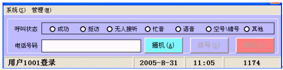 - 坐席功能,坐席人員通過電腦鼠標操作,取新客戶資料,點擊撥號,同時,用鼠標操作記錄撥號過程和通話過程的一些設(shè)置(撥號成功、忙線、無人接、客戶反饋信息等)。坐席電腦將分類顯示忙線電話列表、無人接電話列表、感興趣客戶列表等信息,以便做下一輪撥號參考。