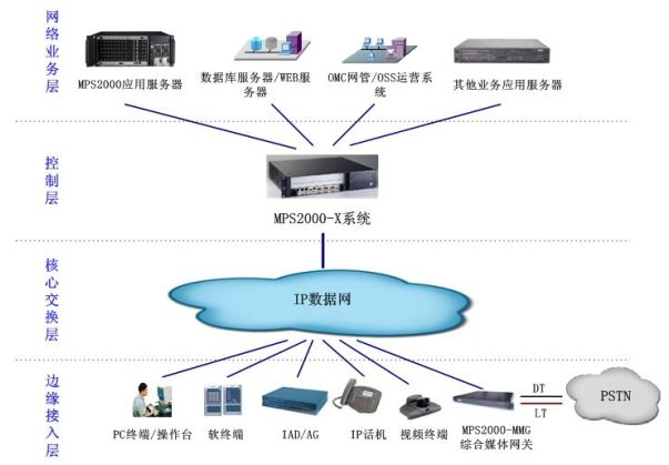 控制層:由MPS2000-X作為軟交換應(yīng)用,完成呼叫控制、媒體網(wǎng)關(guān)接入控制、資源分配、協(xié)議處理、路由、用戶(hù)認(rèn)證、計(jì)費(fèi)等功能,并可向用戶(hù)提供基本語(yǔ)音業(yè)務(wù)、增值語(yǔ)音業(yè)務(wù)、話(huà)務(wù)臺(tái)業(yè)務(wù)等。