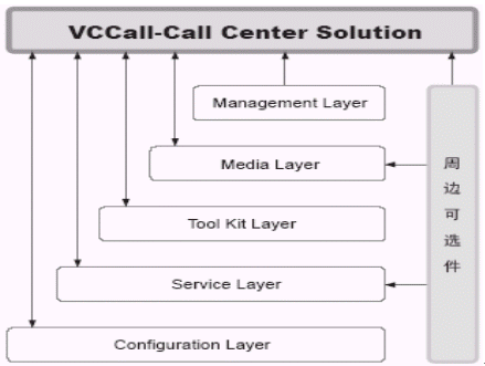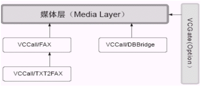 Media Layer由VCCall/DBBridge、VCGate(Option)、VCCall/FAX、VCCall/TXT2FAX、VCCall/FAX、VCCall/TXT2FAX組成VCCall媒體層提供了除電話之外進(jìn)行交互的其他媒體組件,包括:傳真VCCall/FAX、數(shù)據(jù)庫(kù)訪問(wèn)媒體VCCall/DBBridge。