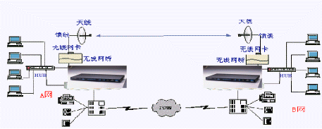 A網(wǎng)與B網(wǎng)分別為兩個(gè)局域網(wǎng),通過(guò)兩臺(tái)WavePoint II無(wú)線(xiàn)網(wǎng)橋?qū)蓚(gè)局域網(wǎng)連在一起,網(wǎng)橋上的RJ45口或BNC細(xì)纜接口與局域網(wǎng)相連。每臺(tái)網(wǎng)橋上插有一塊WaveLAN無(wú)線(xiàn)PC卡,PC卡的射頻輸出端口,通過(guò)饋線(xiàn)接到天線(xiàn),通過(guò)PC卡來(lái)完成無(wú)線(xiàn)鏈路的連通。無(wú)線(xiàn)網(wǎng)橋連接完成后的效果類(lèi)似HUB級(jí)連。IP語(yǔ)音網(wǎng)關(guān)-HGW-904的局域網(wǎng)接口(RJ45)連接到局域網(wǎng)的HUB上,根據(jù)用戶(hù)實(shí)際的話(huà)務(wù)量,選用Line端口接入用戶(hù)電話(huà)交換機(jī)(PBX),PBX接普通電話(huà)機(jī)和傳真機(jī),并連接至電話(huà)公網(wǎng)(PSTN)。其中所需設(shè)備:HGW-904
