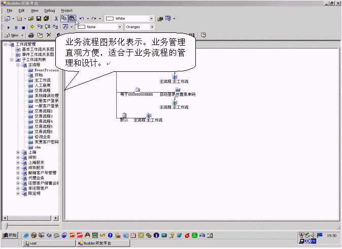 該產(chǎn)品通過將所有業(yè)務(wù)分別處于樹形化的節(jié)點(diǎn)上,可以直觀的對業(yè)務(wù)進(jìn)行增加、刪除、修改的管理。增加子業(yè)務(wù)的時(shí)候,必須帶有業(yè)務(wù)類別,實(shí)現(xiàn)業(yè)務(wù)管理歸類化,避免業(yè)務(wù)管理的混亂。該產(chǎn)品還支持業(yè)務(wù)流程的樹形化表示,使業(yè)務(wù)流程開發(fā)者可以方便地了解業(yè)務(wù)流程的全局框架。
