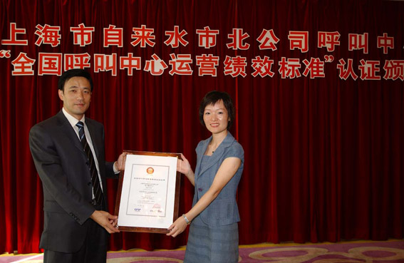 2004年9月16日,上海自來水市北有限公司正式通過《全國呼叫中心運營績效標準》(CCCS-PQ)認證(四星級客戶服務(wù)中心) ,成為中國公用事業(yè)第一家,也是上海地區(qū)首家通過此認證的呼叫中心。