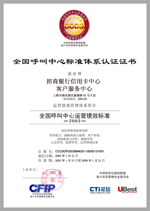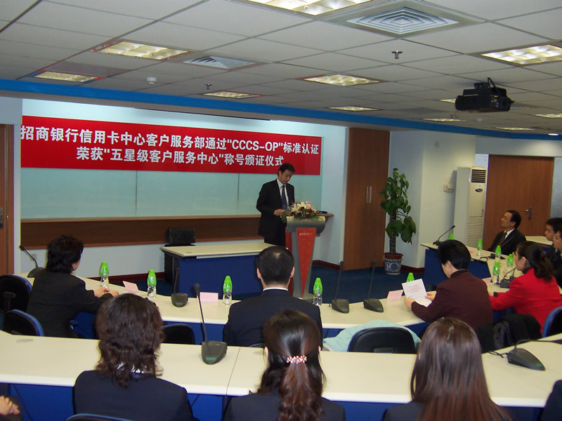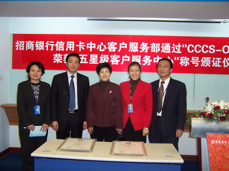 經(jīng)過長達(dá)8個月時間的準(zhǔn)備和嚴(yán)格的認(rèn)證審核,由中國信息化推進(jìn)聯(lián)盟客戶關(guān)系管理專業(yè)委員會常務(wù)副主任郭晨東先生親自掛帥組成的項目評審專家小組從領(lǐng)導(dǎo)能力、戰(zhàn)略規(guī)劃與部署、客戶價值、績效衡量與分析、現(xiàn)場管理、人員管理、流程管理、運營績效結(jié)果等八個范疇對招商銀行信用卡中心客戶服務(wù)部進(jìn)行了全面而嚴(yán)格的審核,涉及五大類上百項詳細(xì)的運營績效指標(biāo),歷經(jīng)初審評估、現(xiàn)場初審、初審評估報告提交與確認(rèn)、標(biāo)準(zhǔn)試運行、績效全面提升、最終評審等階段,最終審核確認(rèn)招商銀行信用卡中心客戶服務(wù)完全符合并部分超越《全國呼叫中心運營績效標(biāo)準(zhǔn)》(CCCS-OP-2003)的各項標(biāo)準(zhǔn)指標(biāo)和要求,于2005年1月31日正式批準(zhǔn)招商銀行信用卡中心通過該標(biāo)準(zhǔn)的五星級認(rèn)證,授予“五星級客戶服務(wù)中心”稱號。