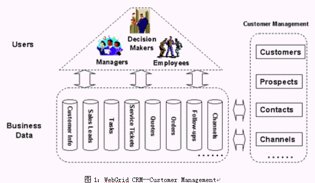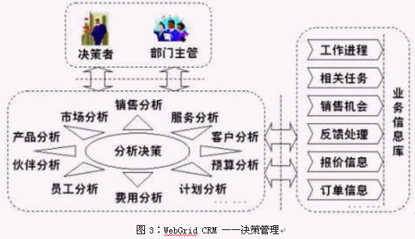 WebGrid CRM是基于CRM理念而設計的,它將面向客戶的所有業(yè)務進行整合,提供了統(tǒng)一的業(yè)務平臺,并使用工作流技術將各種業(yè)務緊密聯系起來。WebGrid CRM 的功能可以歸納為三個方面:1) 對銷售、營銷和客戶服務三部分業(yè)務流程的信息化;2) 與客戶進行溝通所需要的手段(如電話、傳真、網絡、Email等)的集成和自動化處理;3) 對上面兩部分功能所積累下的信息進行的加工處理,產生客戶智能,為企業(yè)的戰(zhàn)略戰(zhàn)術的決策作支持。見下圖所示: