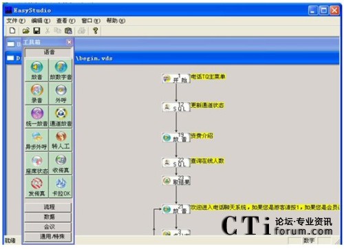 兩個(gè)集成環(huán)境,Easy Studio負(fù)責(zé)自動(dòng)語(yǔ)音流程的編輯和調(diào)試,EasyAdmin負(fù)責(zé)對(duì)語(yǔ)音卡硬件的操作和按照EasyStudio生成的具體語(yǔ)音流程的實(shí)現(xiàn)。EasyCTI綜合實(shí)現(xiàn)了呼叫中心中IVR(Interactive