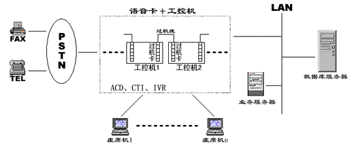 在一些小型CALL CENTER系統(tǒng)中,人們通常通過語音板卡加工控機的方式搭建系統(tǒng),通常一臺設(shè)備就集成了ACD、IVR、CTI等各種資源,各資源的使用、調(diào)派通過軟件進行控制,有效的解決了建設(shè)成本高、系統(tǒng)構(gòu)造繁復(fù)的問題,具有相當(dāng)?shù)撵`活性。然而由于工控機和語音板卡容量有限,同時其標(biāo)準最多只能是工業(yè)級標(biāo)準,因此在構(gòu)建相對大型的呼叫中心時就總是捉襟見肘。為了增加系統(tǒng)容量,解決多臺PC之間進行通道交換的難題,人們又設(shè)計了過機卡和過機線來解決,其應(yīng)用系統(tǒng)如下圖:
