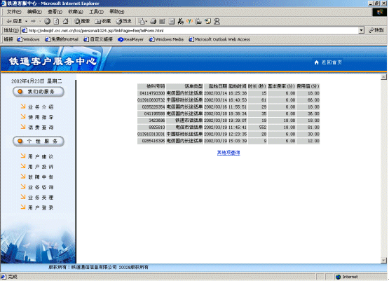 - 實時清單查詢:包括主叫號碼、主叫位置、被叫號碼、主叫開始時間、時長、費率、總金額、賬戶余額/欠費查詢,包括用戶名、賬號/卡號、余額/欠費金額。