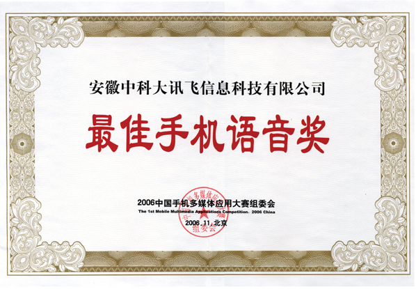 近日,首屆中國(guó)手機(jī)多媒體應(yīng)用大賽組委會(huì)將“2006最佳手機(jī)語(yǔ)音獎(jiǎng)”這份沉甸甸的獎(jiǎng)牌和證書(shū)授予了科大訊飛。這一由數(shù)十位業(yè)界專家和百萬(wàn)手機(jī)用戶慎重評(píng)選出的獎(jiǎng)項(xiàng),充分說(shuō)明了科大訊飛在手機(jī)語(yǔ)音應(yīng)用領(lǐng)域的領(lǐng)先地位,其分量不言而喻。