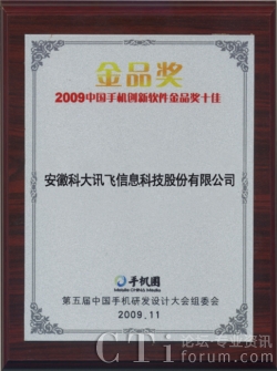 科大訊飛獲“2009中國手機(jī)創(chuàng)新軟件金品獎十佳”企業(yè)