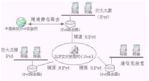 FH6501(IPv6路由器)已經(jīng)在北方交通大學學生IPv6實驗床實際安全運行了六個月。北方交通大學學生IPv6實驗床采用我公司IPv6路由器產(chǎn)品,架構(gòu)了三個主節(jié)點,借助隧道連接到由Nokia資助建設(shè)的中國高校IPv6實驗床。目前三個主節(jié)點之間的連接是借助于學校原有的IPv4網(wǎng)絡(luò),通過隧道技術(shù)實現(xiàn)節(jié)點間的通信(見圖示)。