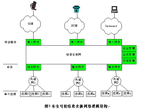 整個安全可控信息交換網(wǎng)系統(tǒng)由三個邏輯部分組成:網(wǎng)關、信息交換網(wǎng)、管理。接入網(wǎng)關連接各種公共服務網(wǎng),包括Internet網(wǎng)、GSM、PSTN、CATV等,它將不同公共服務網(wǎng)的通信協(xié)議轉(zhuǎn)換成統(tǒng)一的信息交換網(wǎng)的XML協(xié)議。