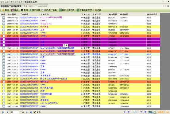 3) 工作流閉環(huán)、客戶通話歷史,客戶聯(lián)系歷史,工單流轉(zhuǎn):工作流系統(tǒng)是通過(guò)工單實(shí)現(xiàn)各工作流環(huán)節(jié)的聯(lián)系以及工作流的定義管理,工作流狀態(tài)查詢、更改的。操作員可根據(jù)用戶的不同業(yè)務(wù)請(qǐng)求,建立相應(yīng)的工單記錄,并對(duì)該事后處理過(guò)程進(jìn)行跟蹤;也可對(duì)要處理的事務(wù)形成工單轉(zhuǎn)給相應(yīng)的操作員,并跟蹤該工單的處理過(guò)程;可定期提示操作員處理要過(guò)期的工單,以提高服務(wù)質(zhì)量;每次處理過(guò)程都會(huì)有詳細(xì)的記錄,以便統(tǒng)計(jì)查詢 。如圖8、9、10: