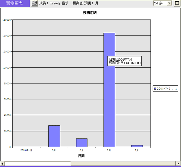 * 100% = 504,402.50元的一個(gè)預(yù)測(cè)值,在相同時(shí)間段的機(jī)會(huì)預(yù)測(cè)值將被累計(jì)求和。很顯然,可以在不同時(shí)間點(diǎn)(例如6月1日、7月1日、8月1日、9月1日)多次對(duì)2004年9月的銷(xiāo)售額進(jìn)行預(yù)測(cè)。得到一系列的銷(xiāo)售預(yù)測(cè)值變動(dòng)趨勢(shì)。