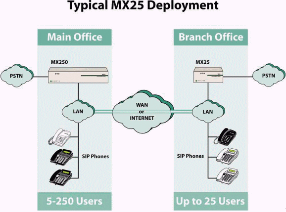 當與MX250一起使用時, MX25提供了一種既能將MX250的功能擴展至分支機構(gòu),同時又可確保該分支機構(gòu)與PSTN有效連接的低成本的解決方案。遠程機構(gòu)的工作人員同樣可以使用語音信箱、自動話務(wù)員、在線狀態(tài)和即時消息等功能。如同在總部工作一樣這些遠程機構(gòu)的工作人員可以與企業(yè)內(nèi)部任意其它地點的人員進行溝通,也可以擔當接線員或ACD(自動話務(wù)分配)組成員的工作。