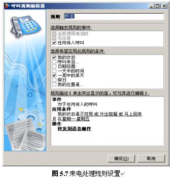 用戶可以設(shè)置一個(gè)或多個(gè)來電處理規(guī)則,來電處理規(guī)則能夠協(xié)助用戶處理來電,讓客戶得到最好的電話支持或服務(wù)。我們可以這么使用此功能,如:外出時(shí)將所有來電轉(zhuǎn)至語音信箱,節(jié)假日時(shí)將電話轉(zhuǎn)至手機(jī)等。